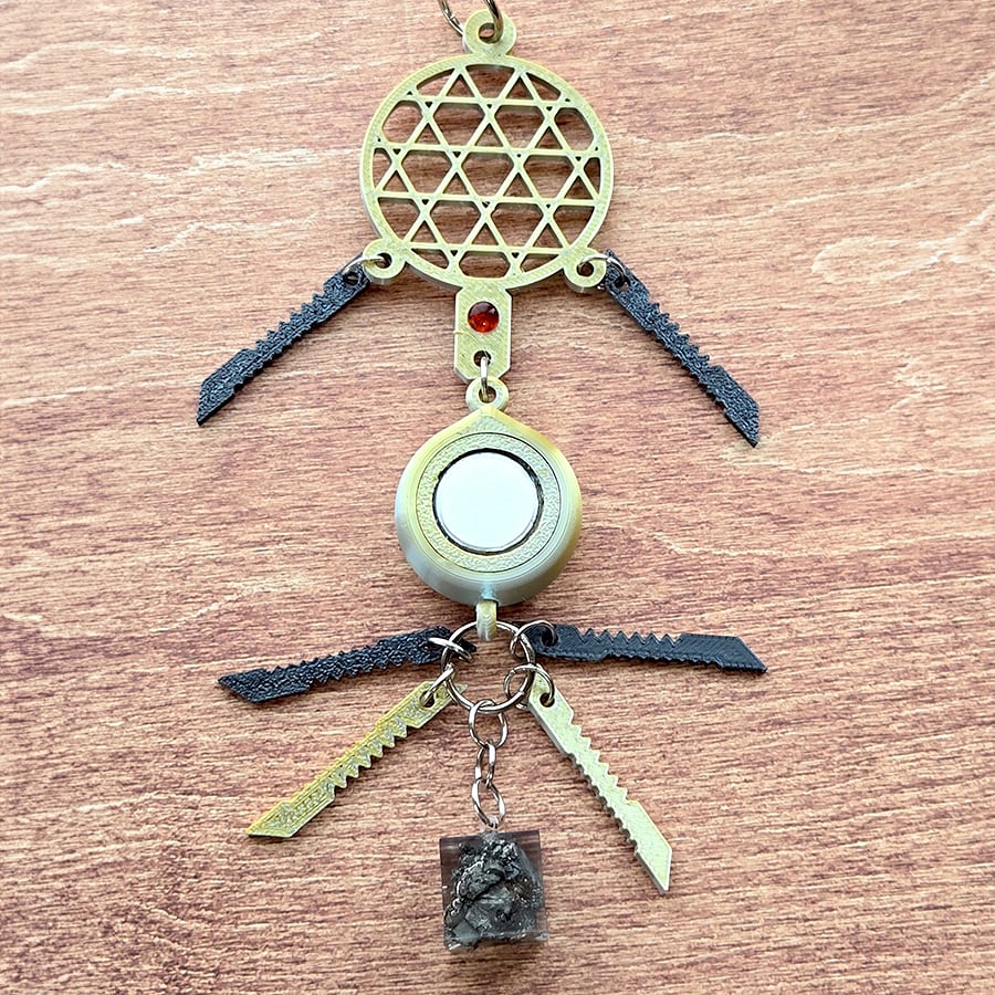 悪夢を捉えるというドリームキャッチャーのデザインをベースにして、龍音堂らしい要素をこれでもかと詰め込んだ贅沢な護符である「環羅」を、身につけるよりも、室内や空間のエネルギーをよくするという、ドリームキャッチャーやサンキャッチャーなどの要素をより強化し、パワフルにしたものとなっています。