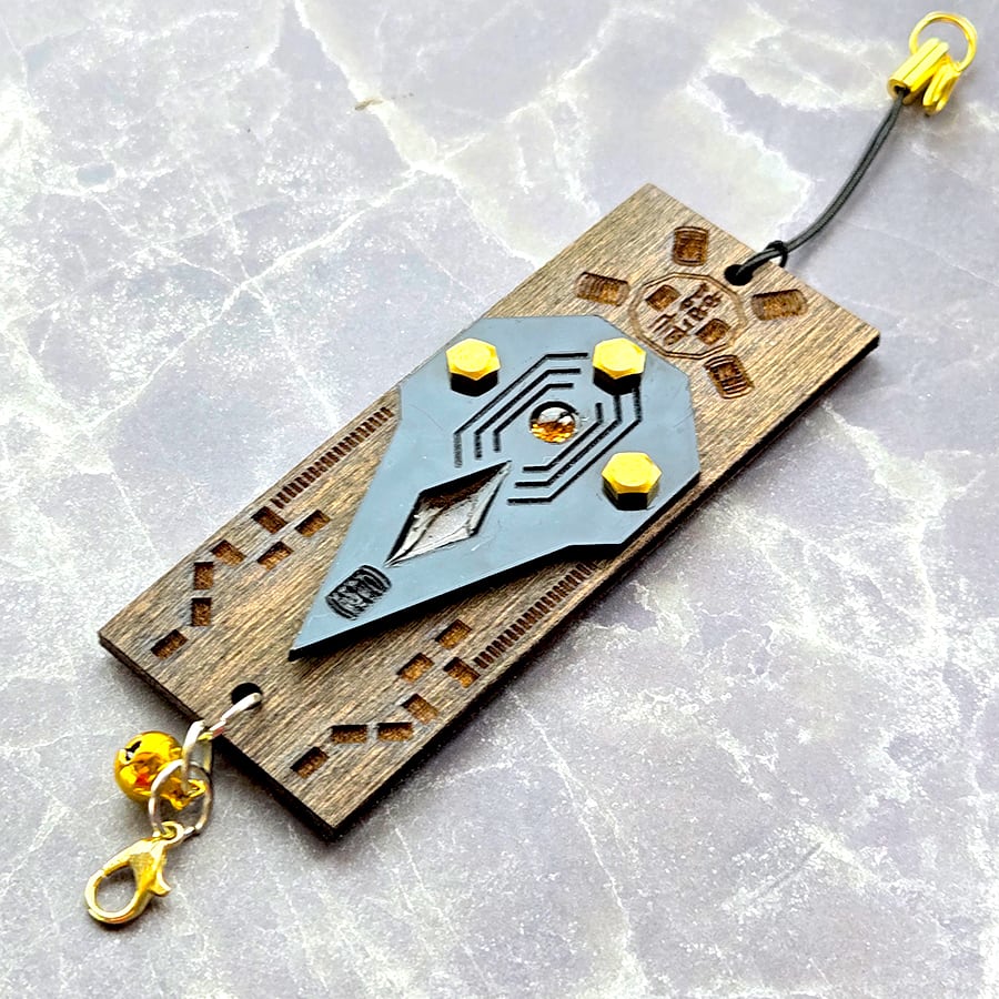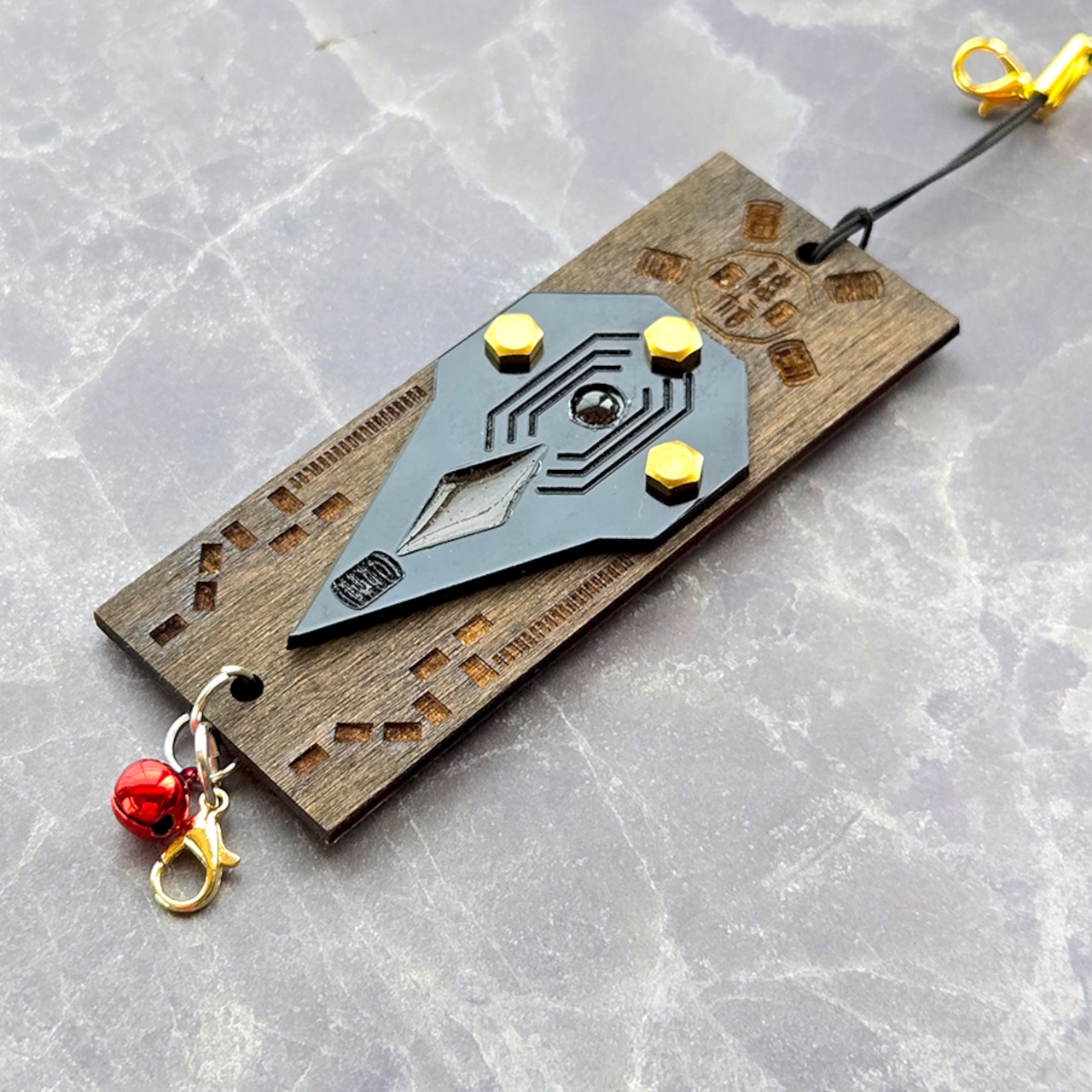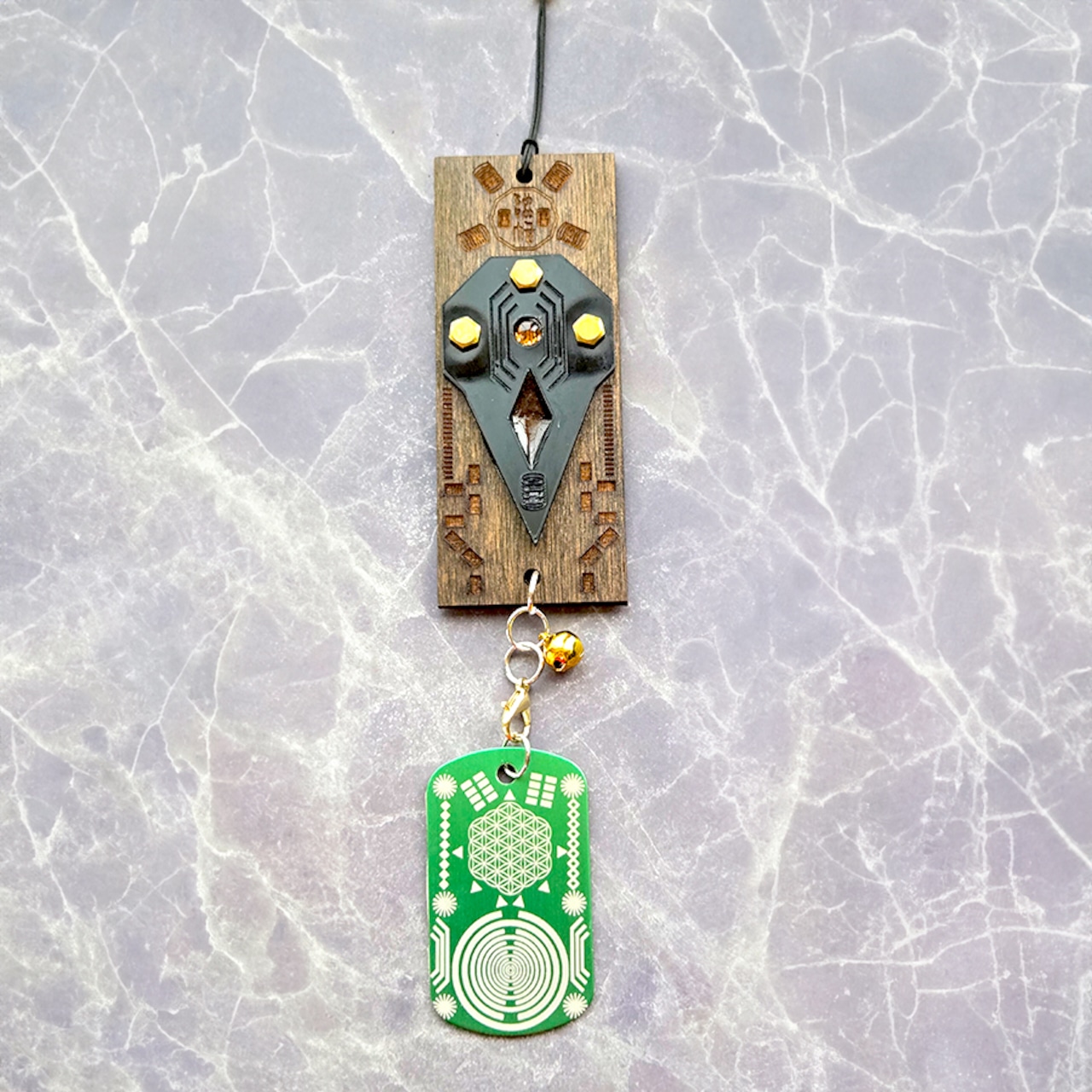 表面にはエネルギーを増幅させるシンボルと、邪気を取り除く「黒水晶」を配置し、さらにエネルギーを蓄積し、邪気や穢れを祓うといわれている「桃木」を封入しています。